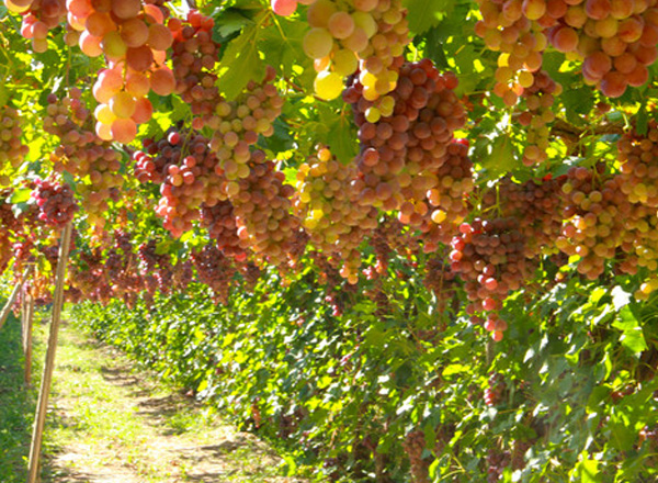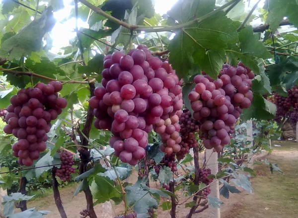 ? ? 紅提,又名晚紅、紅地球、紅提子,商品名稱紅提,屬歐亞種,是由美國加利福尼亞州立大學于70年代用(皇帝×L12-80)×S45-48雜交育成。果穗大,整齊度好,平均單粒重10 克,最大單粒重13克,紅色或紫紅色,果皮中厚,易剝離,肉質(zhì)堅實而脆,細嫩多汁,硬度大,刀切而不流汁。香甜可口,風味獨特。7月下旬開始著色,9月下旬成熟。紅地球葡萄不易掉粒,耐貯運,冷藏可至2-3月,貨架期長。豐產(chǎn)性好,一般畝產(chǎn)1750-2000公斤,品質(zhì)上等,市場競爭力強,是鮮食葡萄品種中最珍貴的和最具有商業(yè)價值的品種之一。